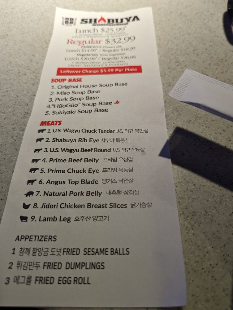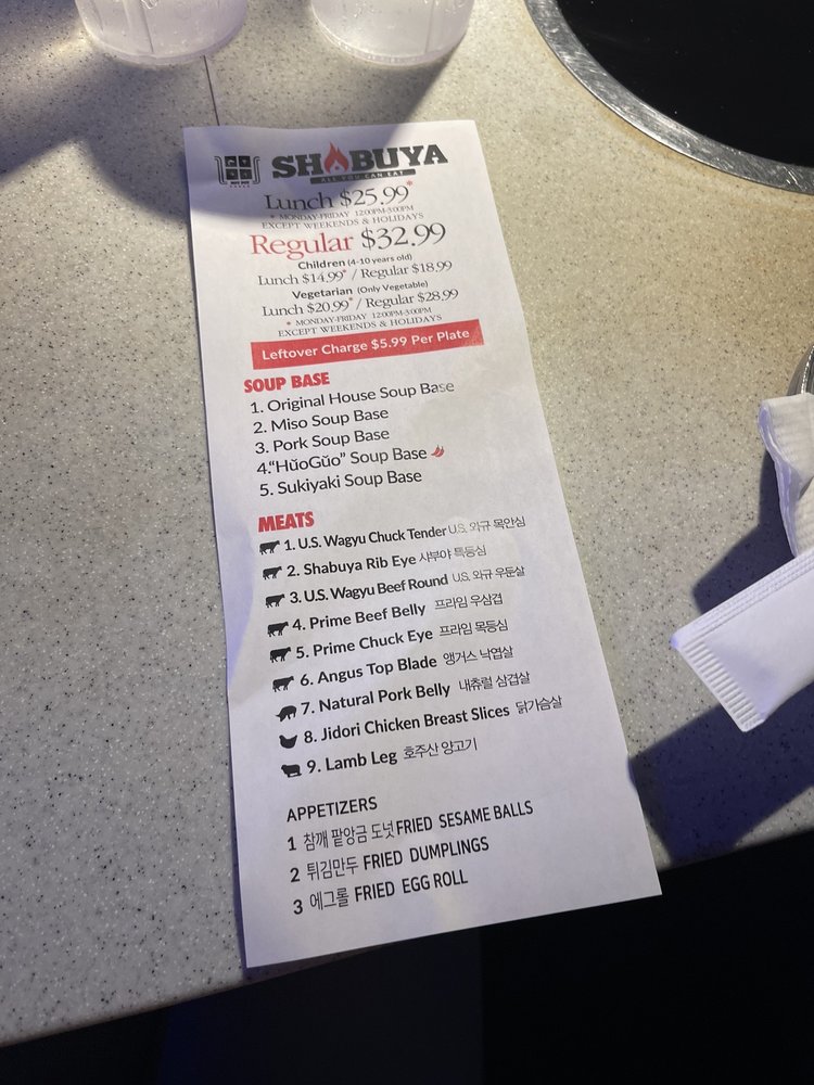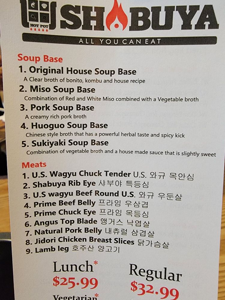 **Shabuya**, a hotspot for hot pot enthusiasts, offers a wide array of fresh meats, seafood, and vegetables for a customizable dining experience. Located in Los Angeles, this Korean-inspired restaurant provides an inviting atmosphere with attentive staff ensuring a memorable meal. The menu includes vegan and vegetarian options, with flavorful broths like Chinese and original. Customers praise the quality of meats, diverse soup base choices, and the cleanliness of the self-serve bar. While some reviews mention minor issues like parking confusion and limited vegetable choices, the overall consensus is positive. With a variety of sauces, toppings, and a warm ambiance, Shabuya promises a satisfying dining experience perfect for gatherings with friends and family. Consider making a reservation and indulging in the unlimited shabu shabu offerings for a fulfilling and enjoyable meal.